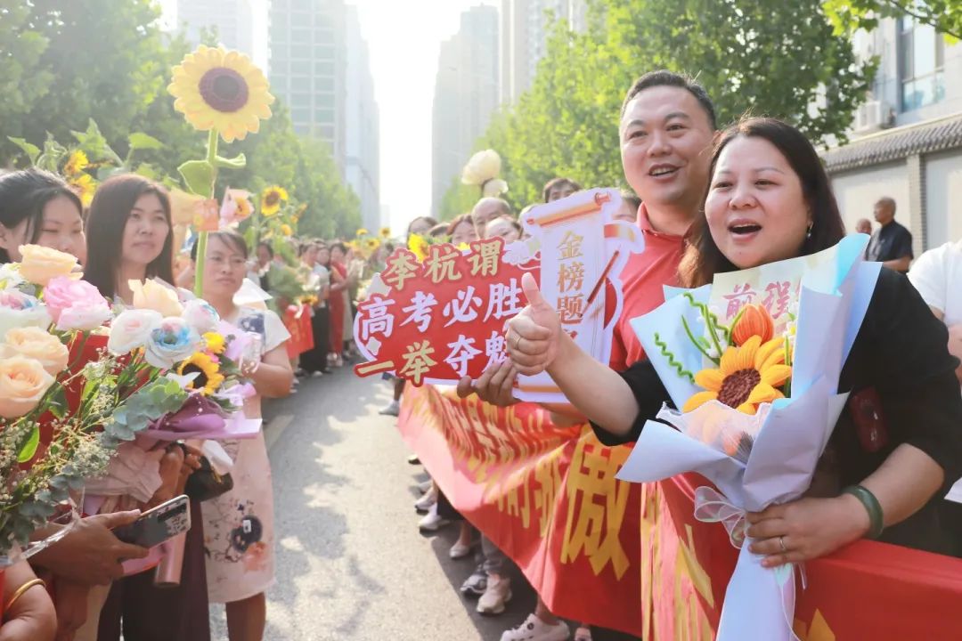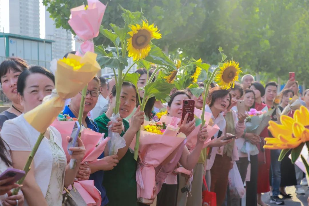 家长们纷纷挥舞着手中的鲜花和向日葵,大声喊着加油和祝福的话语,为孩子们加油助威。考生们带着学校和家长的祝福与期望,更加自信、坚定地迈向考场。
