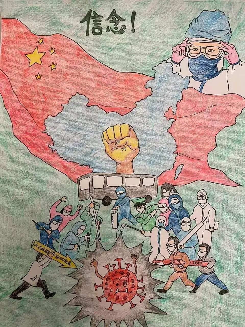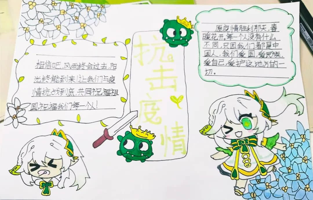 此外,初一年级还开展了一期以疫情防控为主题的手抄报绘制活动。绚丽多彩的手抄报,展现了我校学生在校期间积极乐观的心态,同时也表达了对“白衣天使”们的崇敬之情,寄托了“早日战胜病毒,回归美好生活”的愿望。
