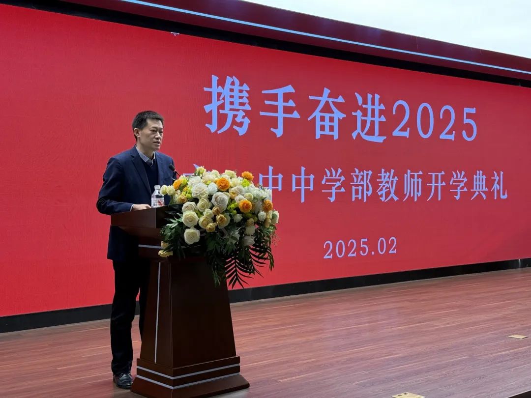 2月10日上午,我校全体教师齐聚一堂,隆重召开了“携手奋进2025”新学期全体教师会。会议伊始,校长林子胜发表了热情洋溢的讲话。他回顾了过去一学期学校在教育、教学、师资队伍建设等方面取得的成绩,对全体教师的辛勤付出表示衷心感谢。同时,也客观分析了学校发展面临的挑战和机遇,明确了新学期的工作计划和任务。随后,林校长重点强调—“2024—2025”学年是我校在第二个三年计划的开篇之年,全体教师要以更加饱满的热情、更加昂扬的斗志、更加务实的作风,投入到新学期的各项工作中,为把我校建成高品质学校再立新功!