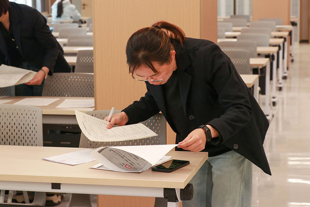 在本次教案集中展评现场,教务处干事将教师们的教案按年级、学科分区布置摆放整齐,每份教案上都附有完整的各环节过程和教学反思。教师们俯身细读每一份教案,指尖划过工整的板书设计,从教学目标的精准性到课堂活动的递进性,从作业分层的科学性到反思改进的针对性,以专业眼光进行全方位审视,形成浓厚的展评氛围。