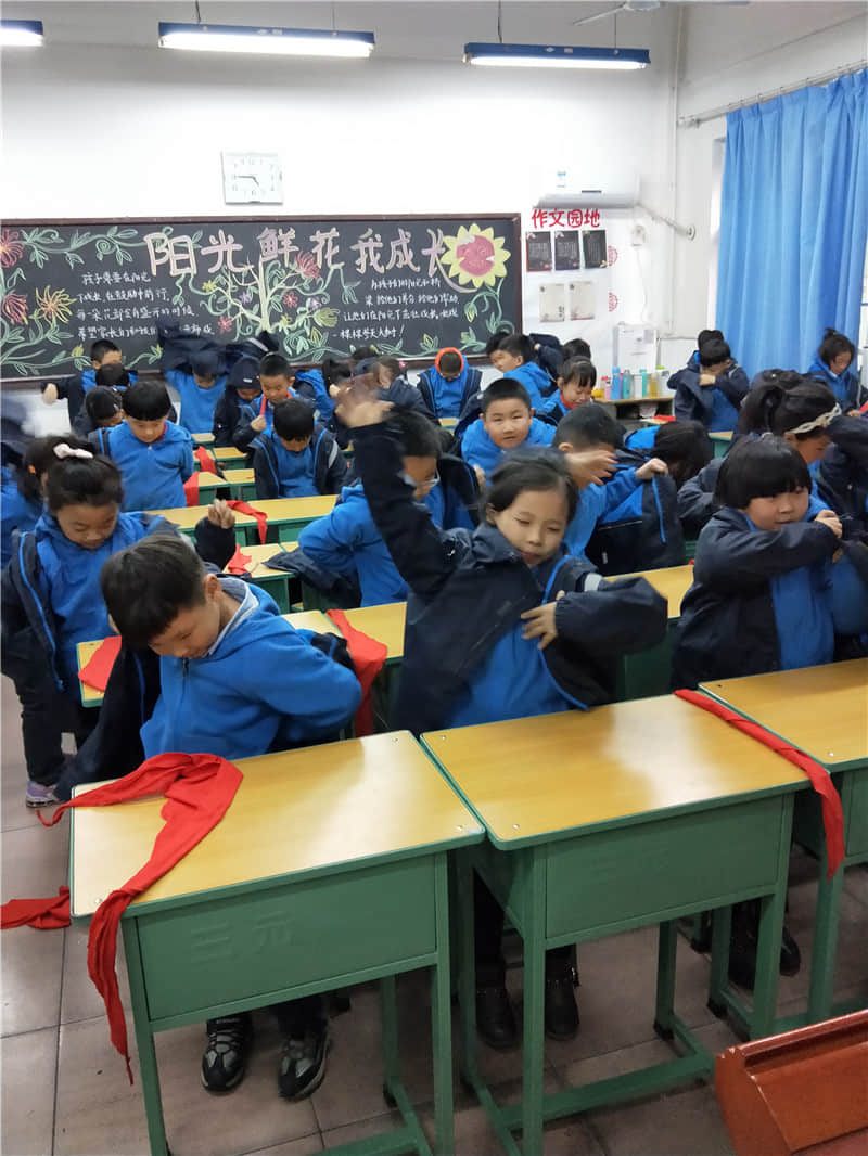 瞧瞧我们二年级的学生,穿衣服多么神速,红领巾系的多么整齐!