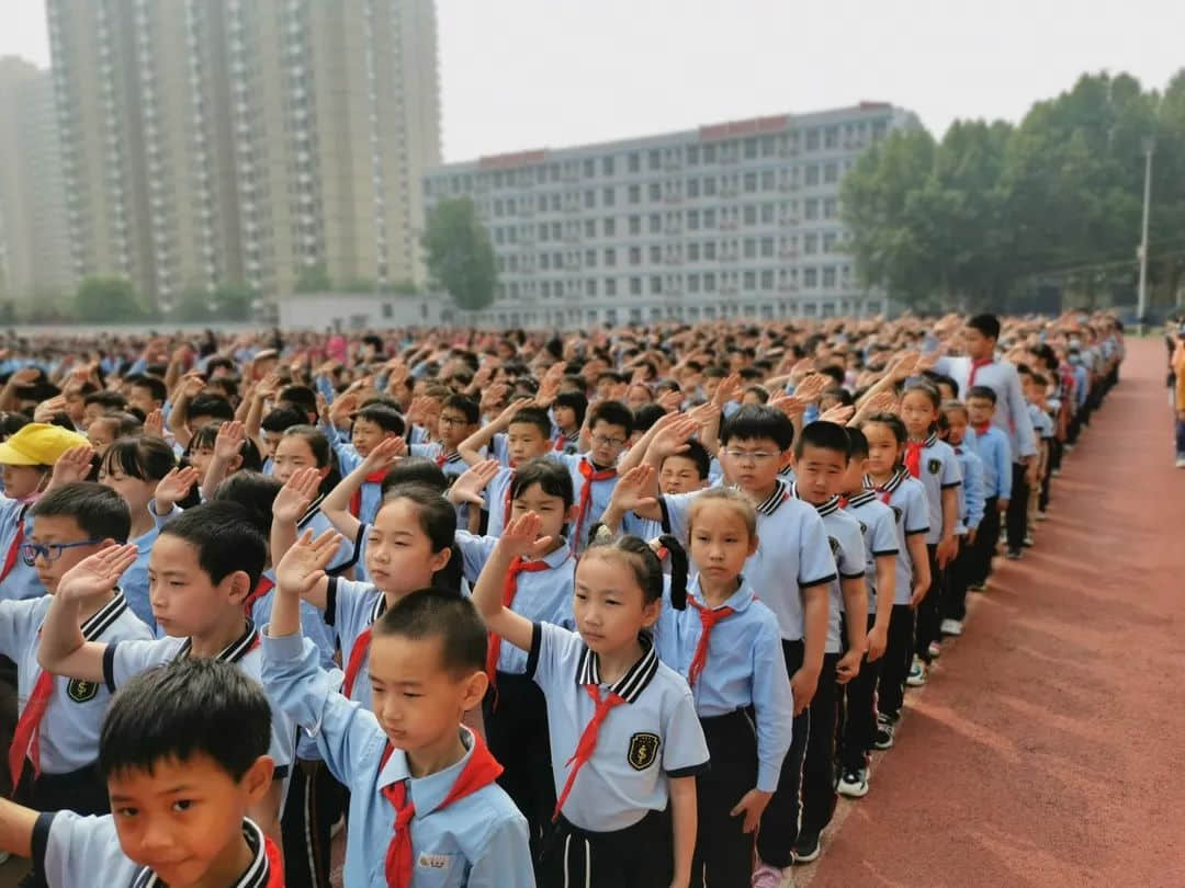 当国歌响起,在国旗下团员教师们精神抖擞、庄严肃穆,少先队员们齐声高唱,祝福祖国繁荣昌盛。
