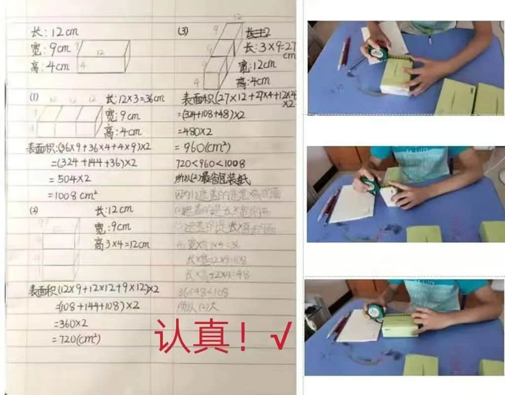 “包装问题”是长方体与正方体的表面积问题在现实生活中的应用。活动中让孩子们经历实际操作,学习分析、解决实际问题的基本过程和方法,体会数学与生活的联系。