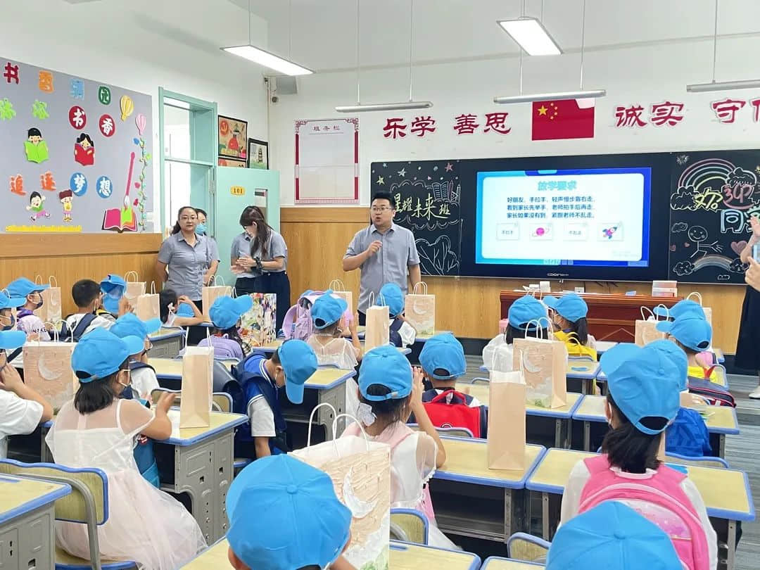 在一年级学生进入教室后,李校长及学校其他领导,进班与小朋友亲切友好交流,虽然校长和教室都是陌生的,但是校长脸上灿烂和蔼的笑容和教室温暖的布置,让孩子们立马感受到了安心。看他们坐姿端正、安静聆听,是多么惹人喜欢的一群小可爱。