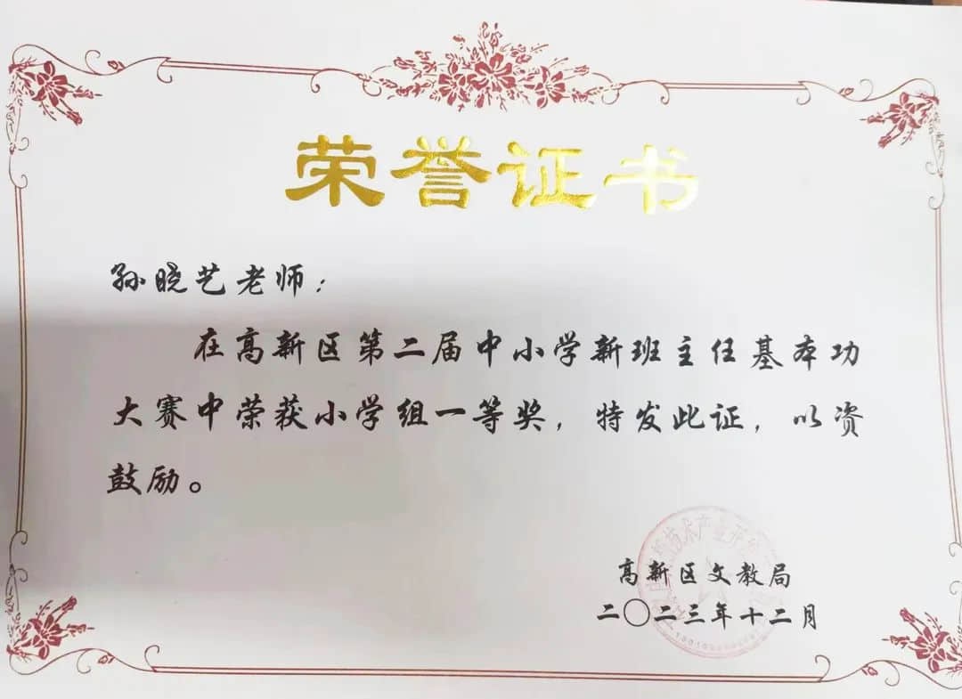 热烈祝贺我校孙晓艺老师荣获高新区第二届中小学新班主任基本功大赛一等奖班主任作为班级的组织者和管理者,既是学校教育任务得以顺利完成的重要力量,也是学生身心