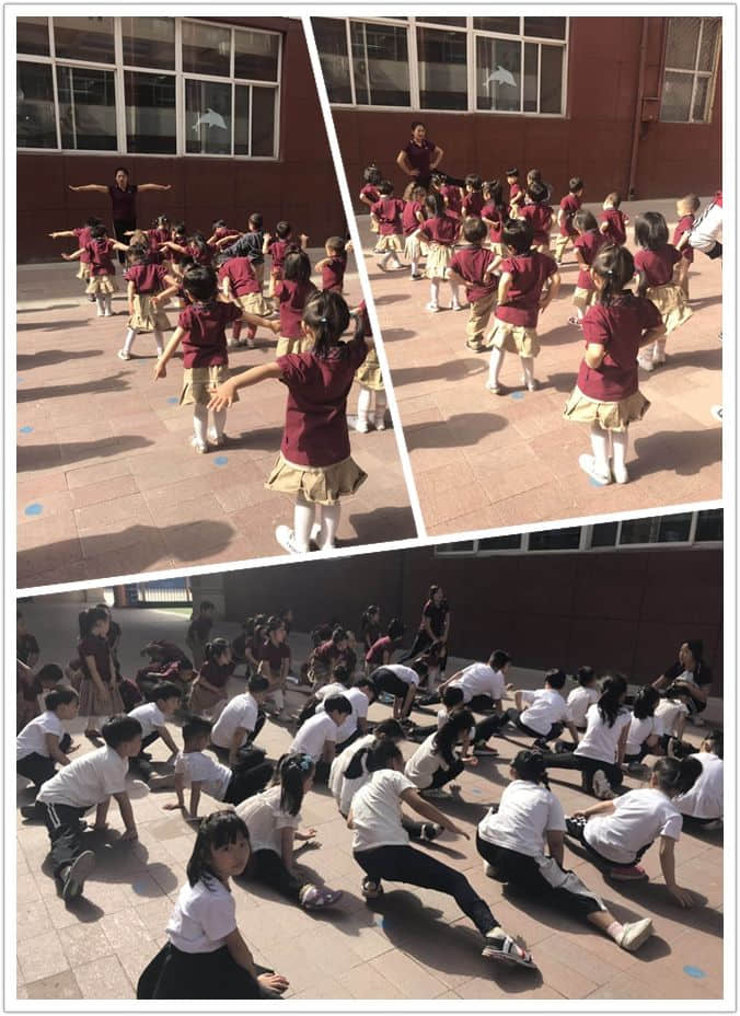 早操之前我们先来做做热身准备,看我们多认真,扭扭脖子,压压腿,这样才能把我们的筋骨舒展开。