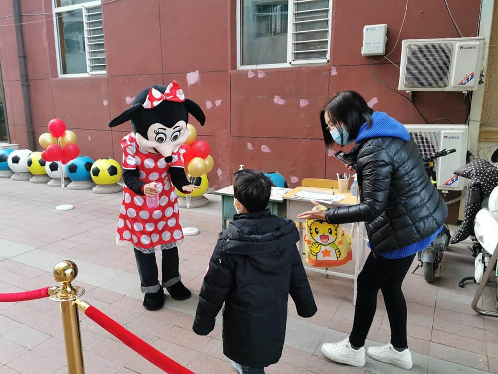 瞧!我们的健康大使米妮、米奇和他的小伙伴们都在干嘛呢?他们热情的和大家打着招呼,为了做好疫情防控,确保孩子们的身体健康,他们不仅为孩子们进行手部消毒,还给每个孩子发放了“儿童口罩”呢!嘻嘻~棒棒哒!